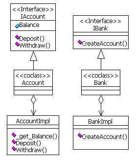 The file Banking.idl contains the MIDL specification for the COM interfaces and classes. The interfaces can be declared dual because tcom can implement objects whose operations are invoked through the IDispatch interface or the virtual function table.